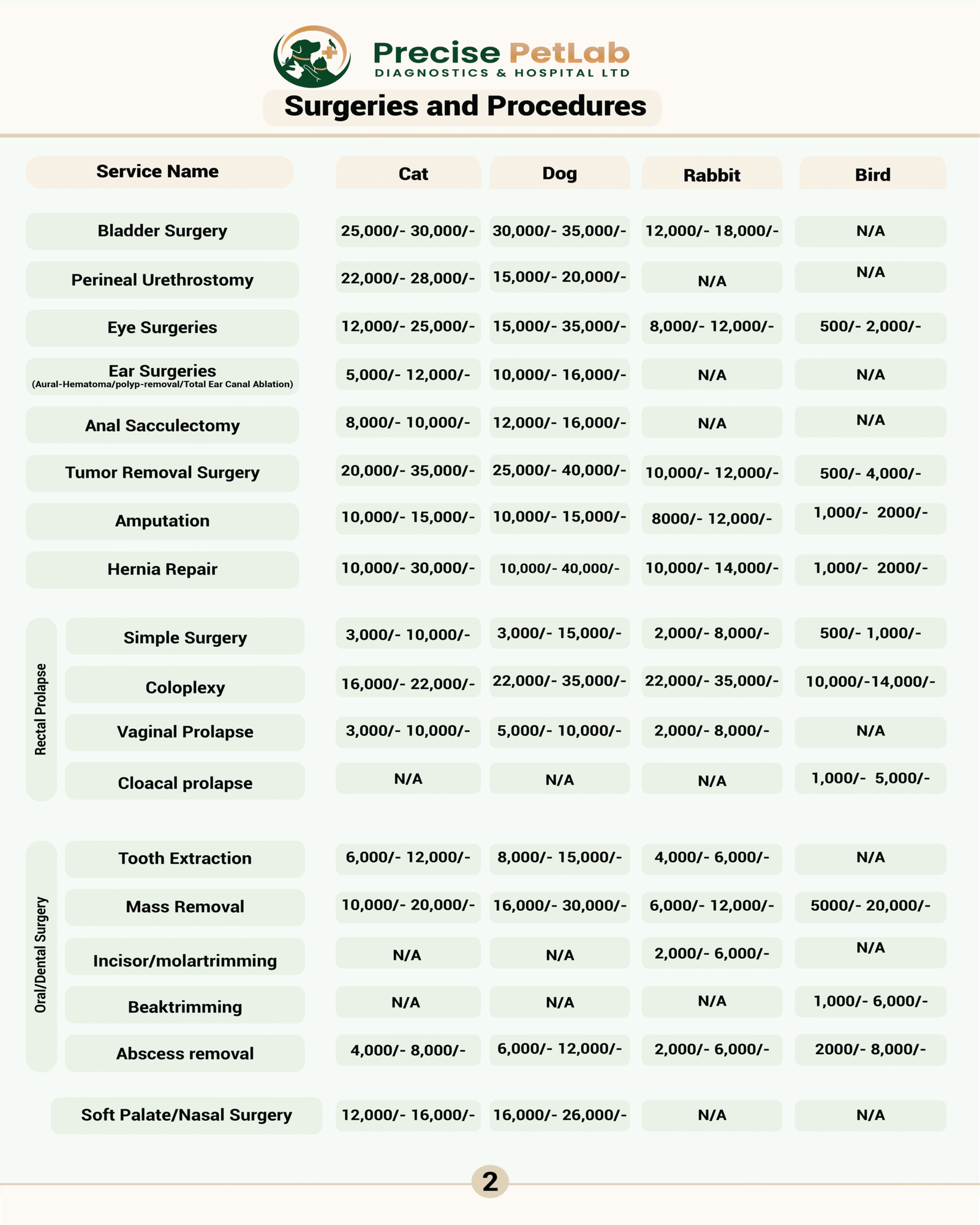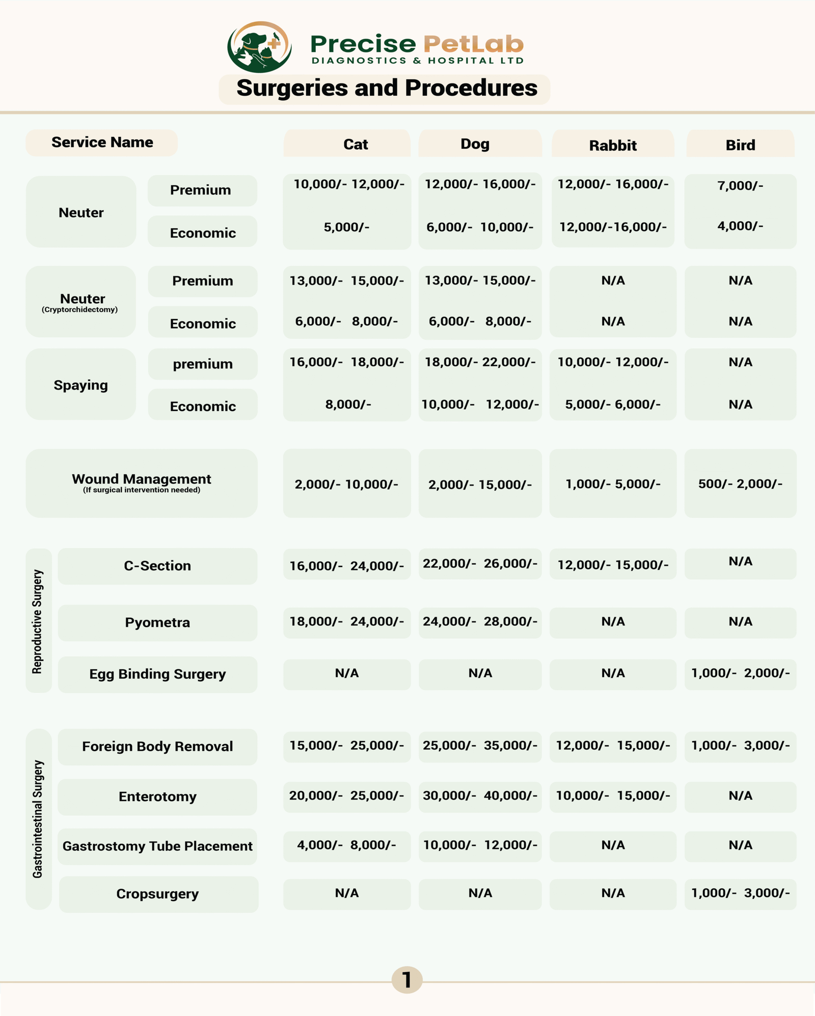 At Precise PetLab Diagnostics and Hospital Ltd., our surgical services are performed with precision and care, utilizing state-of-the-art equipment to ensure the safety and well-being of your pets. Our highly trained veterinarians offer a range of procedures, from routine spaying and neutering to advanced soft tissue surgeries, all conducted in a sterile, modern operating environment. Each procedure is tailored to your pet’s specific needs, with comprehensive pre- and post-operative care to promote swift recovery. Below is our pricing for key surgical services